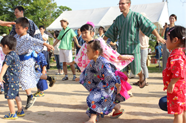 子どもライブラリーのなつまつりは、子ども達の可愛い歌声で始まり、お父さんお母さんも、おじいちゃんおばあちゃん、お姉ちゃんお兄ちゃんも、みんなで楽しく盆踊りを踊ります。会場は、10メートルの大笹を立て、子ども達のつくった輪つなぎで装飾。ひとりひとりのねがいごとの短冊も飾っています。